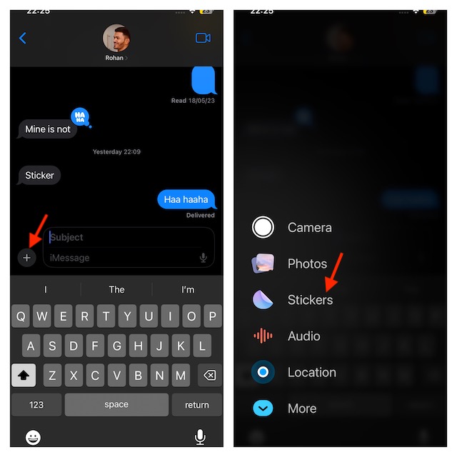 1.Az iPhone készülékén nyissa meg az Üzenetek alkalmazást -> Navigáljon egy beszélgetés szálra -> Érintse meg a „+” gombot, és válassza a matricákat.