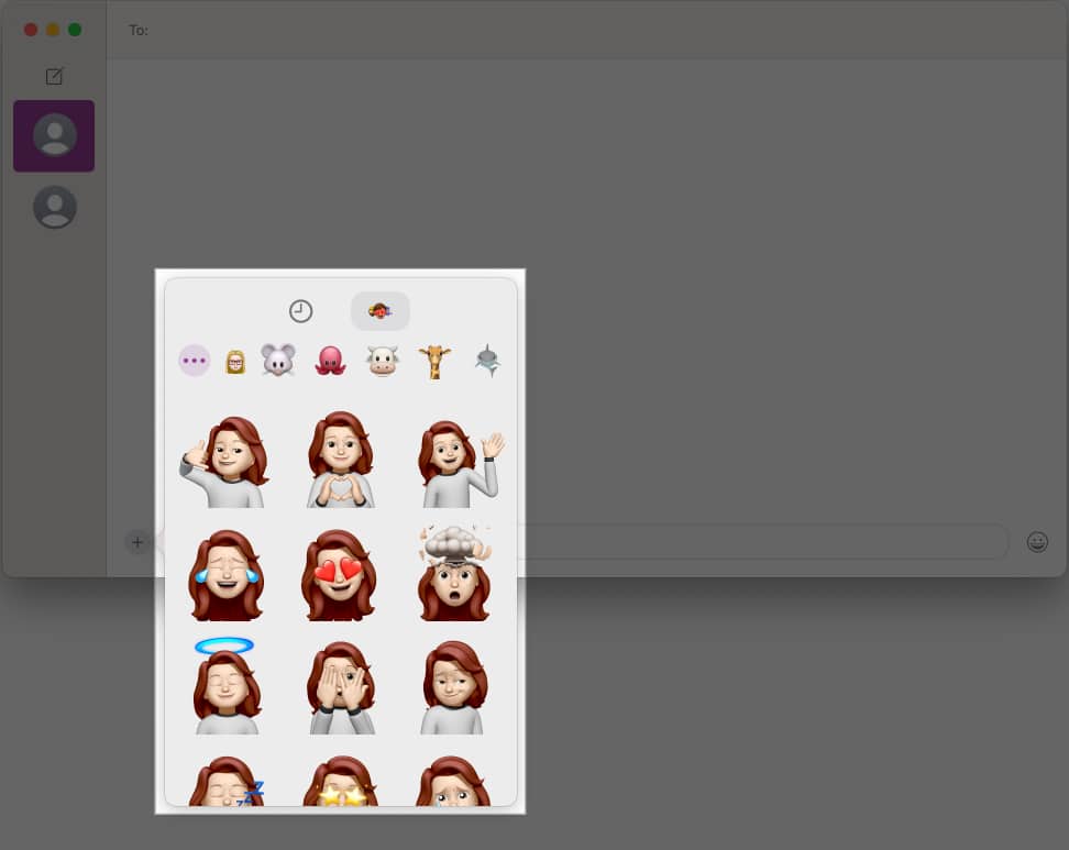 Az Üzenetek alkalmazásban nyisson meg egy beszélgetést, kattintson a+ikon, és válassza kiMatricák- Ezután kattintson a kívánt memoji -ra, és megjelenik a szövegmezőben. Most már készíthet egy képernyőképet a sajtolássalCommand+shift+5A billentyűzeten. Ez megmenti a memoji képét az asztalon.