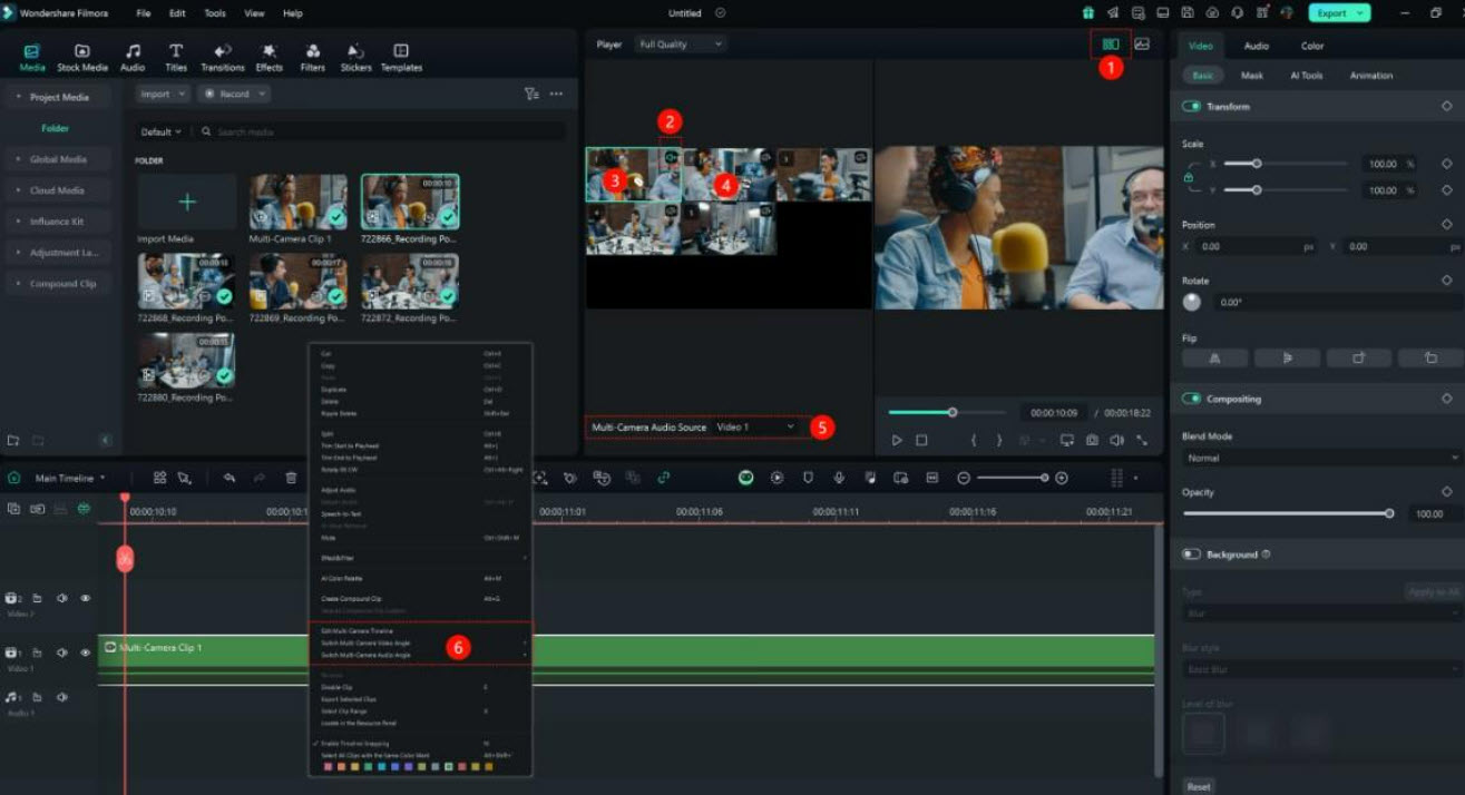 Ahelyett, hogy kézi szerkesztést szerezne a különálló tételekből, a Multicam szerkesztés lehetővé teszi a szögek közötti váltást valós időben. Ez a Filmora szolgáltatás gyorsabbá teszi a folyamatot, és segít jobban összpontosítani a kreatív választásokra.