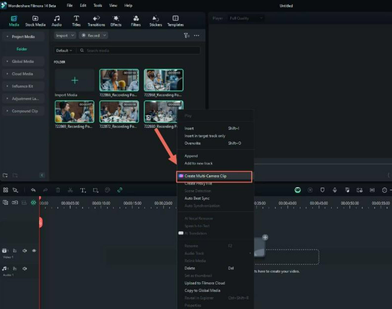 - 1. módszer:Válassza ki az összes videoklipet a médiakönyvtárból. Kattintson a jobb gombbal, és válassza a Multi-Kamera CLIP létrehozása lehetőséget.