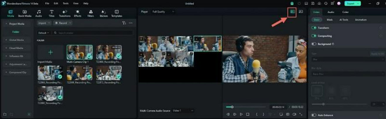 6. lépés:Lépjen a lejátszó ablakba, és kattintson a Switch Multi-Camera View ikonra a jobb felső oldalon. Itt egyidejűleg megtekintheti a multicam klipeket, és válthat közöttük.