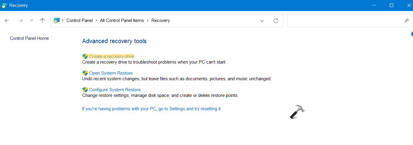 3.Ezután kattintson aHozzon létre egy helyreállítási meghajtótlehetőség a megnyitáshozRecoveryDrive.exe-