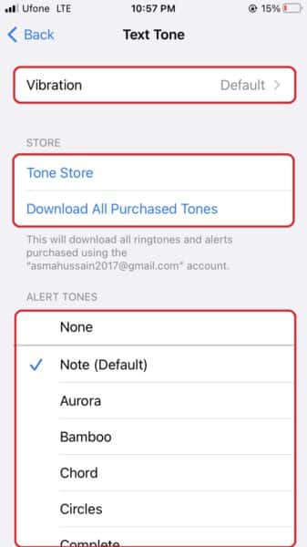 - Most két lehetősége van: testreszabhatja az üzenetek figyelmeztető hangját és testreszabhatja a rezgést. Koppintson egy hangra lentFigyelmeztető hangoka figyelmeztető hangok testreszabásához. Görgessen az elérhető szöveghangok listájának böngészéséhez. Egy hangra koppintva meghallgathatja annak lejátszását. Vegye figyelembe, hogy megérinthetiTone Storeúj figyelmeztető hang letöltéséhez az iTunes Store áruházból.
