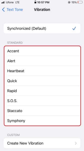 - Ennél a beállításnál megérintheti isRezgésa szövegek rezgésének testreszabásához. Ez segíthet megállapítani, hogy iPhone-ja kapott-e szöveges üzenetet vagy más értesítést.