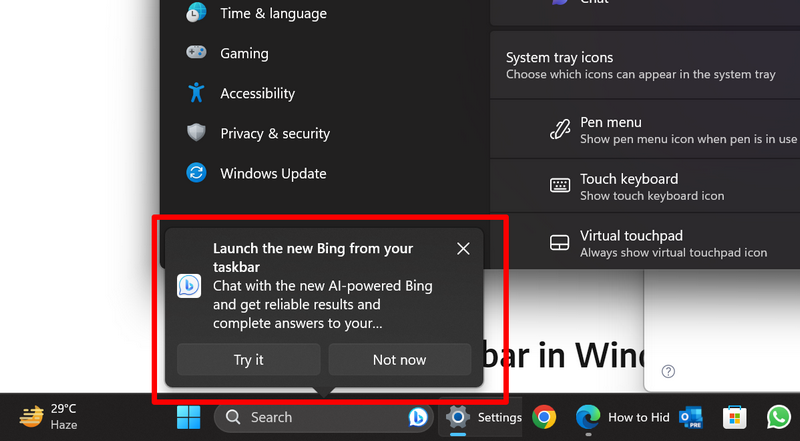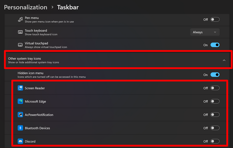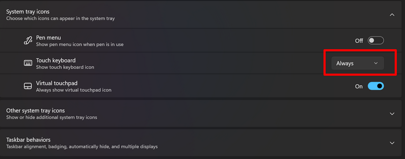 Itt hozzáadhat vagy eltávolíthat bizonyos kisegítő lehetőségeket, például az érintőbillentyűzetet és a virtuális érintőpad gombjait, hogy szükség esetén könnyen elérhesse őket. Az alábbi lépéseket követve hozzáadhatja a fent említett elemeket a Windows 11 rendszert futtató eszköz tálcájának Rendszertálca területéhez: