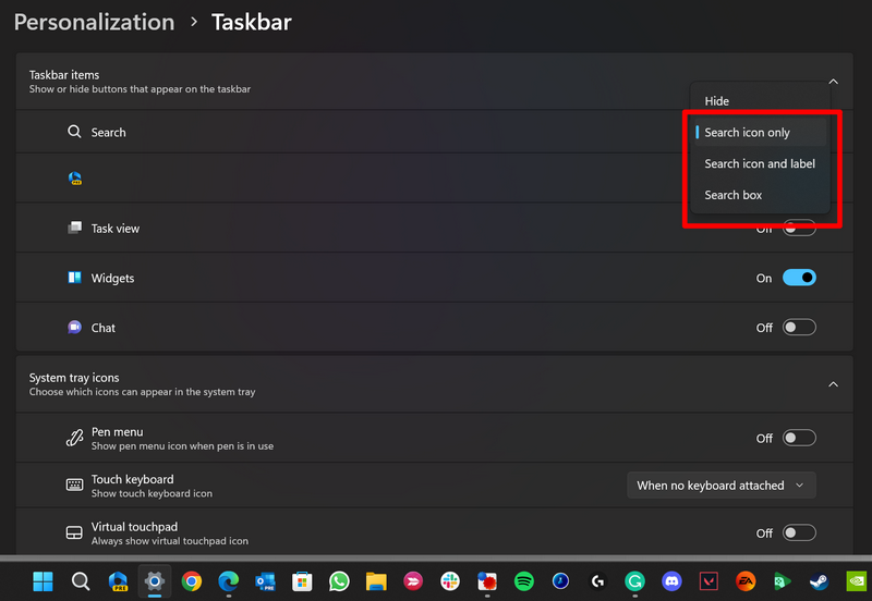 4.Ezen kívül kiválaszthatja aCsak a keresés ikonra,Keresés ikon és címke, ésKeresőmezőa túlcsordulás menüben a keresési felhasználói felület testreszabásához a Windows 11 számítógép vagy laptop tálcáján.