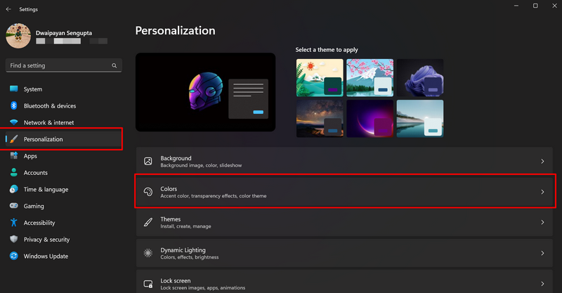 2.Menj aSzemélyre szabásfület a bal oldali navigációs sávon, és lépjen aSzínbeállítások oldal.