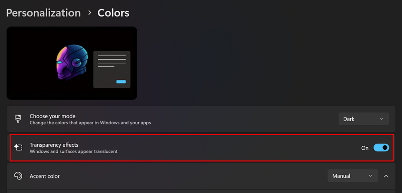 Ha ez be van kapcsolva az eszközön, a tálca tükrözi a háttérkép színeit, és áttetsző hatást kelt, amikor Windows 11 rendszerű számítógépét vagy laptopját használja.