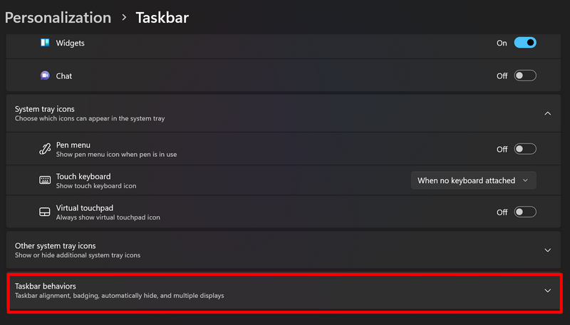 2.A Tálca beállításai oldalon görgessen le aTálca viselkedéseiszakaszt, és kattintson rá a kibontáshoz, ha még nincs kibontva.
