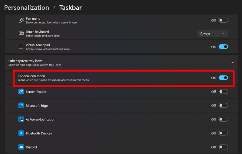 7.Ezenkívül engedélyezheti vagy letilthatja a kapcsolót aRejtett ikon menülehetőség a kis nyíl gomb megjelenítésére vagy elrejtésére a tálcán, amely felfedi a Windows 11 számítógépen vagy laptopon futó háttéralkalmazásokat.