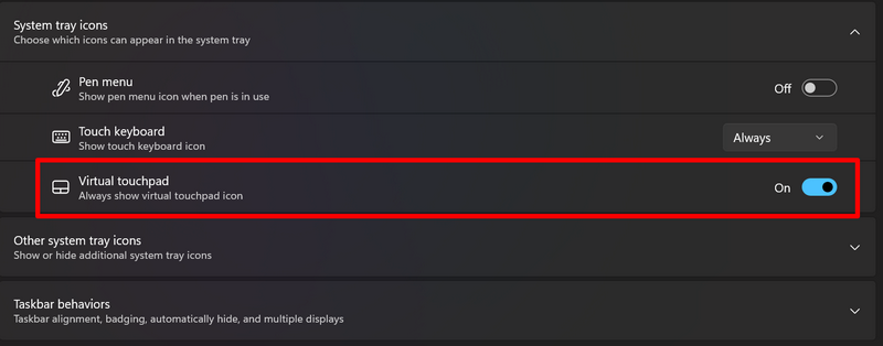 4.Ezután engedélyezze a kapcsolót aVirtuális érintőpadlehetőséget, hogy hozzáadja a tálca Rendszertálca területéhez.