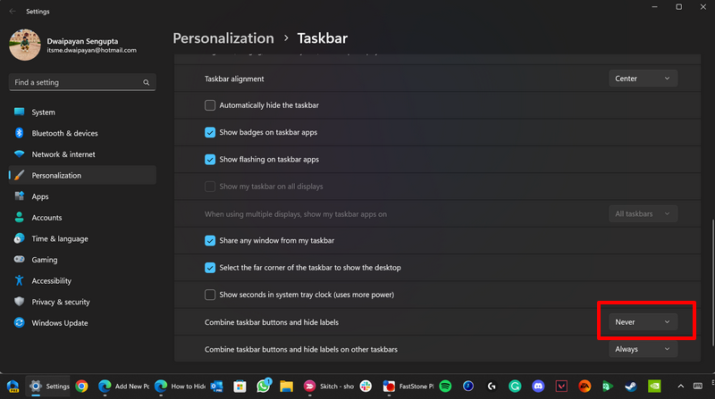 4.Miután az említett beállítást Soha értékre állítja, a megnyitott alkalmazások névcímkéit megtalálja a Windows-eszköz tálcáján.