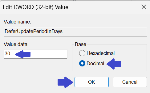 Kattintson a deFerUpdatePeriodindays elemre, és válassza ki az alapot tizedesként. Állítsa be az értéket 0 -ról 30 -ra, majd kattintson az OK gombra.