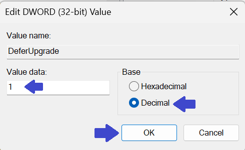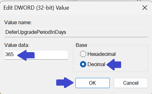 Kattintson a deFerUpgradeperiodindays elemre, és válassza ki az alapot tizedesként. Állítsa be az értéket 0 -tól 365 -ig, majd kattintson az OK gombra.
