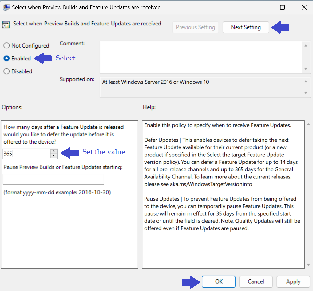 Az értéket 0 -tól 365 -ig állíthatja be. Ez az érték azt a napot jelöli, amelyre késleltetni kívánja a frissítést.