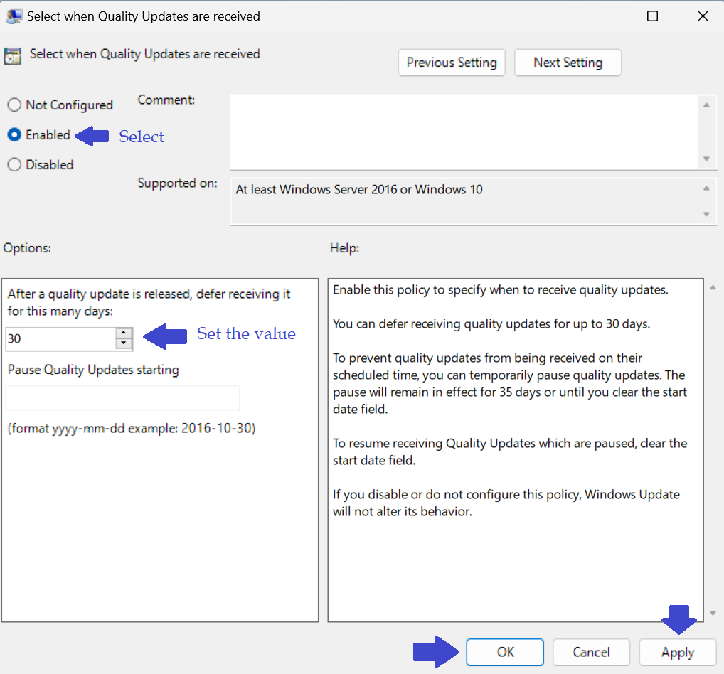 Adja meg a napok számának számát, amelyeknél késleltesse a minőségi frissítést a megjelenése után. Legfeljebb 30 napig késleltetheti. Dönthet úgy is, hogy szünetelteti a frissítéseket akár 35 napig.