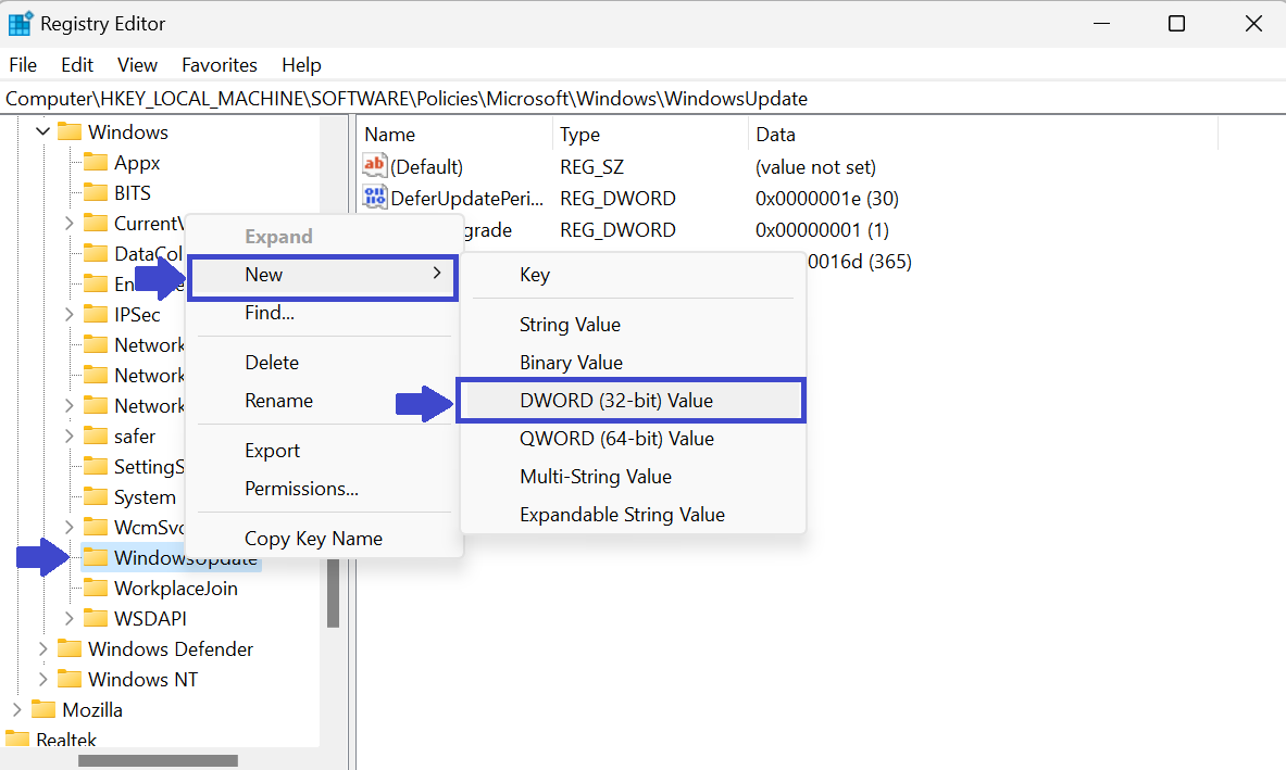 4. A WindowsUpdate gomb létrehozása után most hozzon létre új DWORD (32 bites) értéket, amely elnevezi a deFerUpgrade-t.