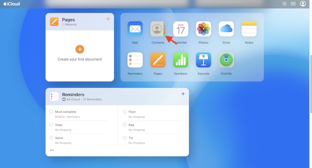 6.Miután sikeresen bejelentkezett iCloud-fiókjába, görgessen le egy kicsit, és kattintson aNévjegyek alkalmazásikon.