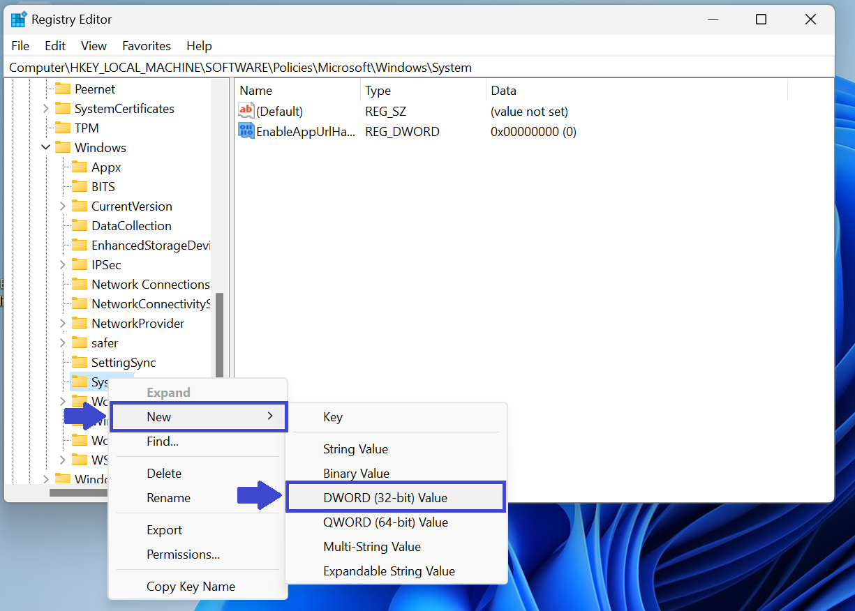 Kattintson a jobb gombbal a System => új => DWord (32 bites) értékre. Írja be az „EnabeAppUrlHandlers” írást, majd kattintson az OK gombra.