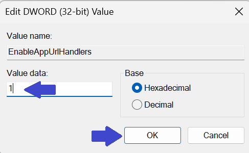 4. Most kattintson a gombraEnabeAppUrlHandlersDWORD érték. Megjelenik a Prompt Box.