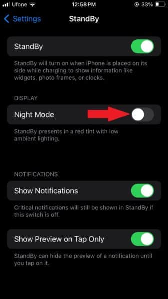 Az iOS 17 készenléti módja tartalmaz egy éjszakai mód funkciót, amely automatikusan bekapcsol, amikor a szoba világítási körülményei alacsonyak. Ez miatt a kijelző piros hangon jelenik meg. Ennek a szolgáltatásnak az a célja, hogy csökkentse a zavaró tényezőket sötétebb környezetben, és segítsen visszatérni az alváshoz, amikor ellenőrzi az éjszakai időt.