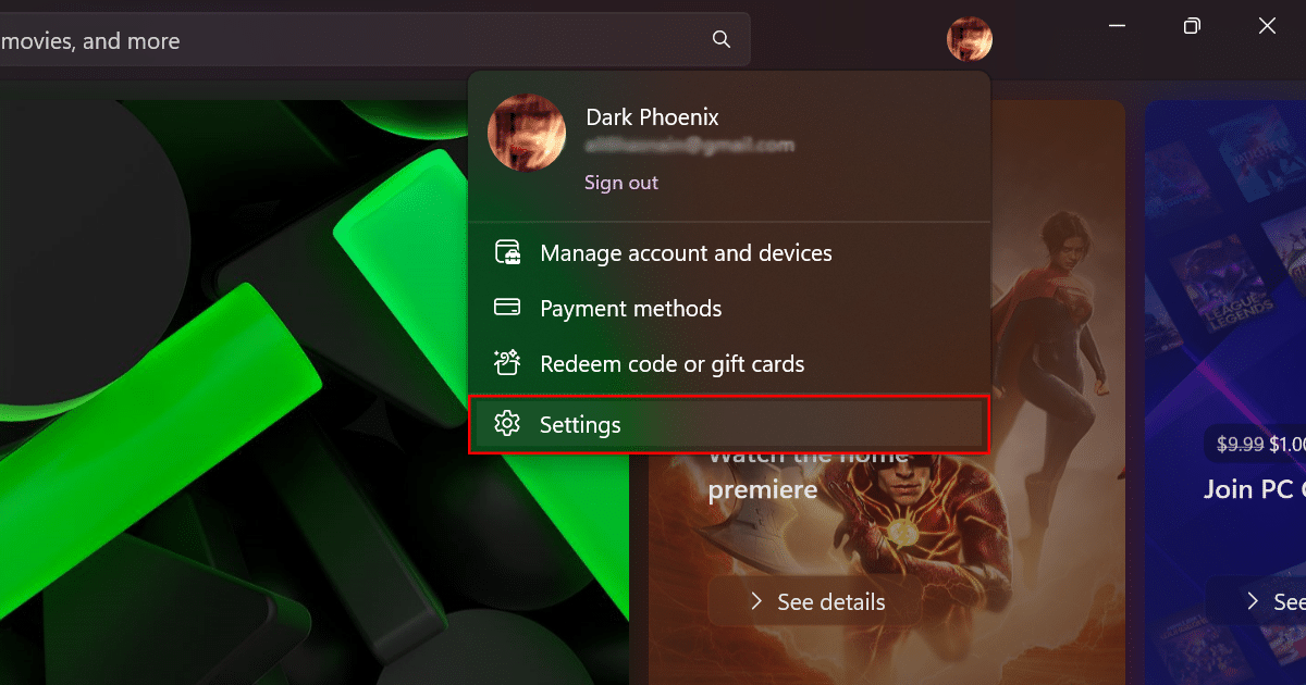 - Kattintson a sajátjáraprofilképa jobb felső sarokban, és válassza kiBeállítások elemre.