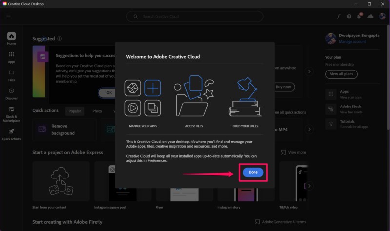 Miután befejeződött, láthatja, hogy a Creative Cloud Desktop alkalmazás megnyílik a Windows 11 PC -n vagy laptopján. Innentől kezdve követheti ugyanazokat a lépéseket az előző módszertől, hogy előfizetési tervet kapjon a Photoshop alkalmazáshoz, és telepítse azt a Windows eszközre.
