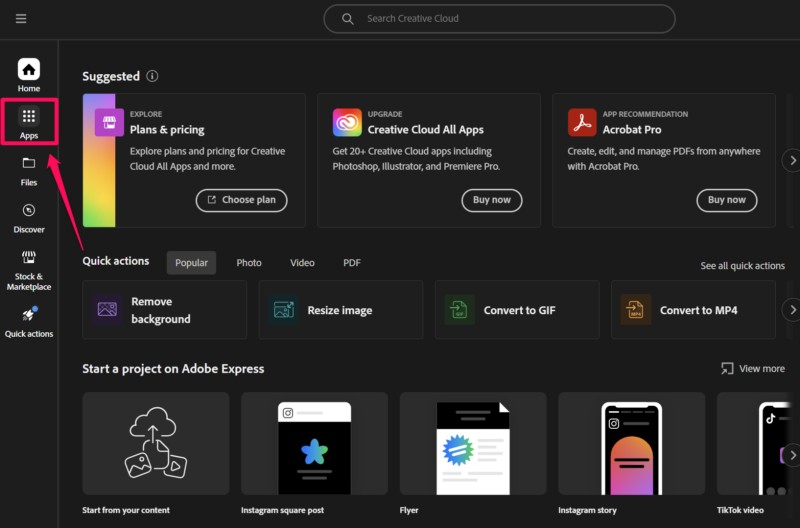 12.Most, aKezdőlapA Creative Cloud alkalmazásból kattintson aApps fülA bal oldali navigációs sávon.