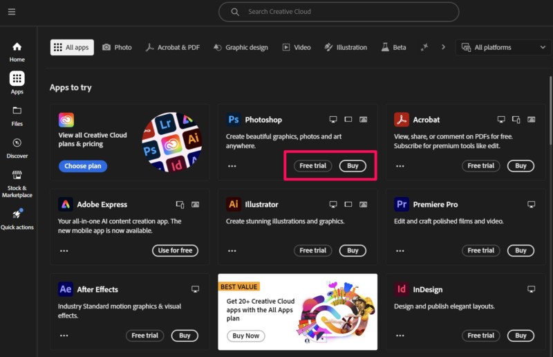 13.A következő oldalon kattintson aIngyenes próbaverzióvagyVétel gombA Photoshop alkalmazáshoz.