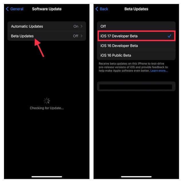 - A következő képernyőn válassza a lehetőségetiOS 17 fejlesztői béta.