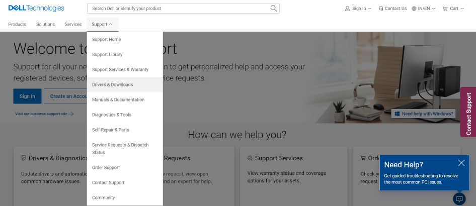 2. lépés: Kattintson a „Támogatás” elemre, és válassza a menüben a „Vezetők és letöltések” lehetőséget.