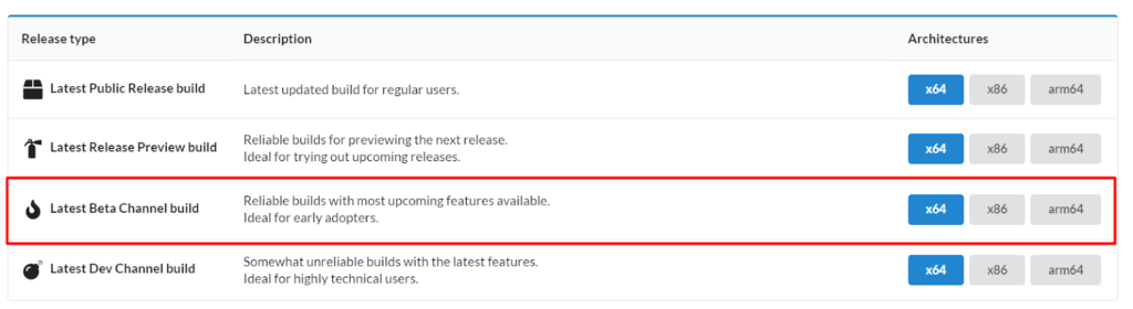 3.Kattintson arendszer építészeteadott aA legújabb béta -csatorna felépítése.