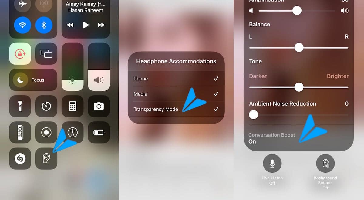 - A „Fejhallgató -szállás” menüben válassza az „Átláthatósági mód” lehetőséget, majd koppintson a képernyő bármely pontjára.