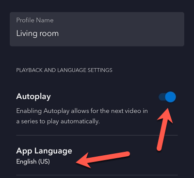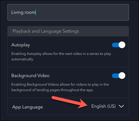 - A lejátszási beállítások szabályozásához válassza ki és módosítsa az opciókat a menübenLejátszás és nyelvbeállítások részt. Például, ha másik nyelvre szeretne váltani ehhez a felhasználói profilhoz, válassza ki ezt a listábólAlkalmazás nyelvelegördülő menüből.