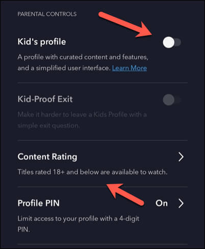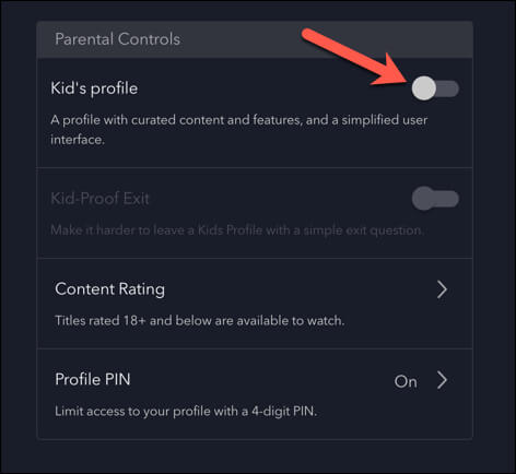 - Ha korlátozni szeretné a hozzáférést bizonyos tartalmakhoz, használja aSzülői felügyeletopciók. Például engedélyezze a csak gyerekeknek szóló profilt a gomb megnyomásávalA gyerek profiljacsúszkát.