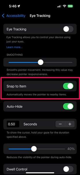 Végül a Tartózkodási vezérlés opciót engedélyezheti vagy letilthatja. Ez azonban automatikusan bekapcsol, amikor beállítja és engedélyezi a szemkövetést iOS-eszközén. A letiltása korlátozza a tartózkodási vezérlést az Eye Tracking használata közben, megakadályozva ezzel az előre kiválasztott művelet végrehajtását.
