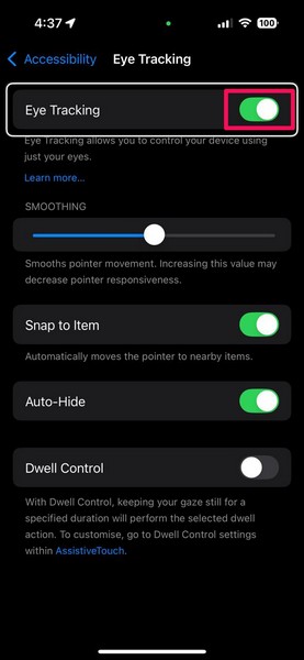 4.Itt,érintse meg a Szemkövetés opció kapcsolójátfent, hogyengedélyezze a funkciótaz iPhone-on.
