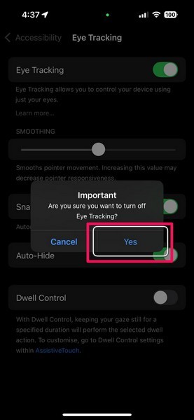 Az Eye Tracking funkció letiltása az iPhone-on olyan egyszerű, mint annak engedélyezése, azzal a különbséggel, hogy természetesen nem kell átmennie a beállítási folyamaton. Sőt, amint azt korábban említettük, még akkor is, ha az Eye Tracking engedélyezve van, és használatban van, továbbra is használhatja az iPhone érintéses funkcióit a vezérléshez.