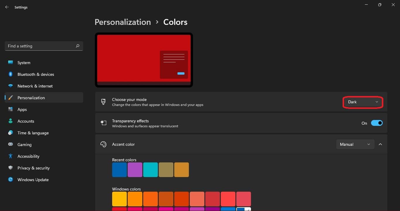 Vegye figyelembe, hogy a Sötét mód engedélyezéséhez a Google Chrome számára meg kell változtatnia a Windows 11 rendszertémáját, hogy a böngésző tükrözze a változást. Így engedélyezheti a Sötét módot a Google Chrome számára Windows 11 rendszeren: