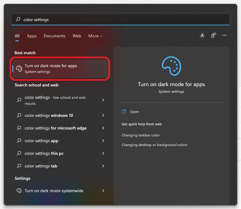 - Nyissa meg a Start menüt, majd írja beSzínbeállításokés nyomja meg az Enter billentyűt a Beállítások alkalmazás megnyitásához. Közvetlenül is megnyithatja a Beállítások alkalmazást, és a Testreszabás > Szín menüpontra léphet.