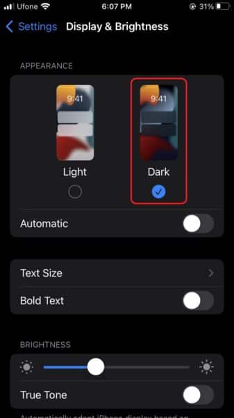 2. Koppintson a gombraKijelző és fényerő. Ekkor megjelenik egy lehetőség a világos és sötét megjelenések közötti váltáshoz.