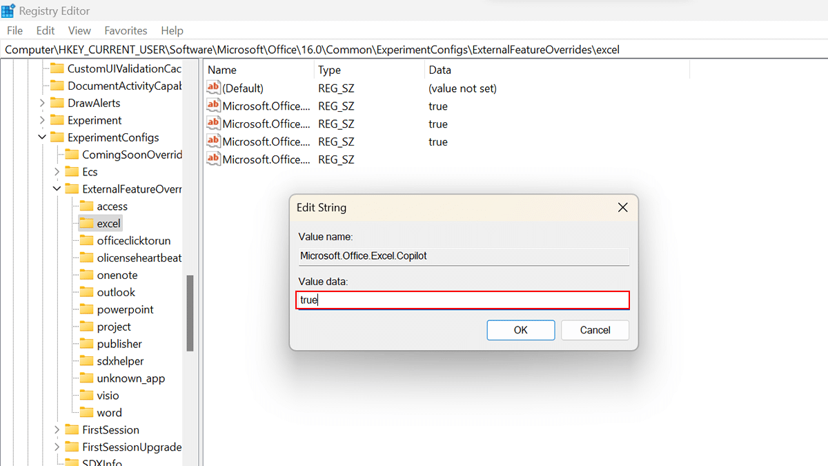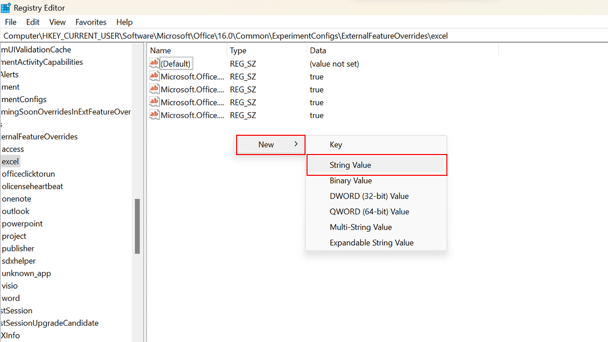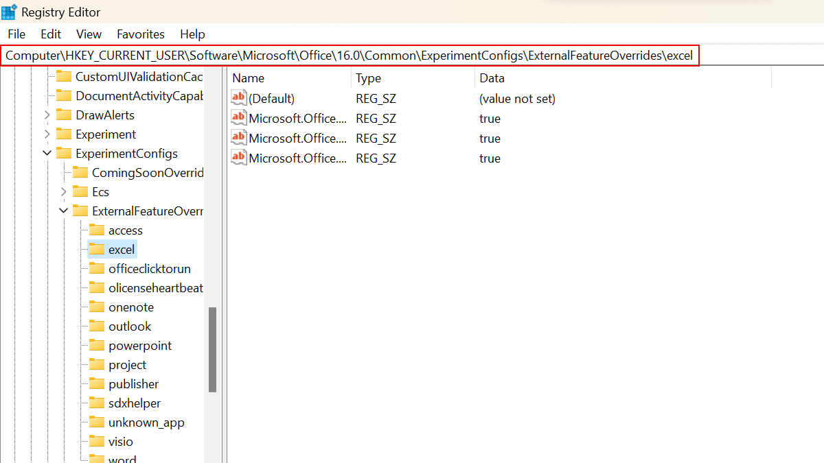 ComputerHKEY_CURRENT_USERSoftwareMicrosoftOffice16.0CommonExperimentConfigsExternalFeatureOverridesexcel