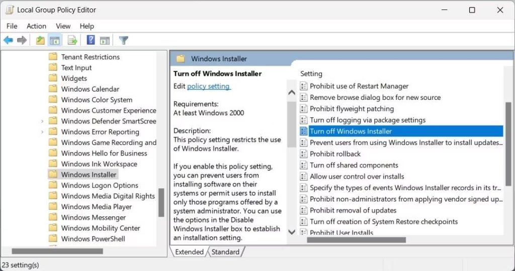 A Windows gépen felhasználhatja a Csoportházirend -szerkesztőt a Windows Installer szolgáltatás engedélyezésére vagy letiltására is. Alapvető fontosságú, hogy ne felejtsük el, hogy ez a segédprogram csak a Windows Pro és az Enterprise Editions segítségével működik. Kövesse ezeket a lépéseket a Szolgáltatás letiltásához a csoportpolitikai szerkesztő használatával: