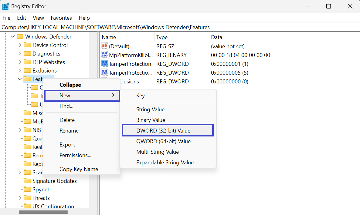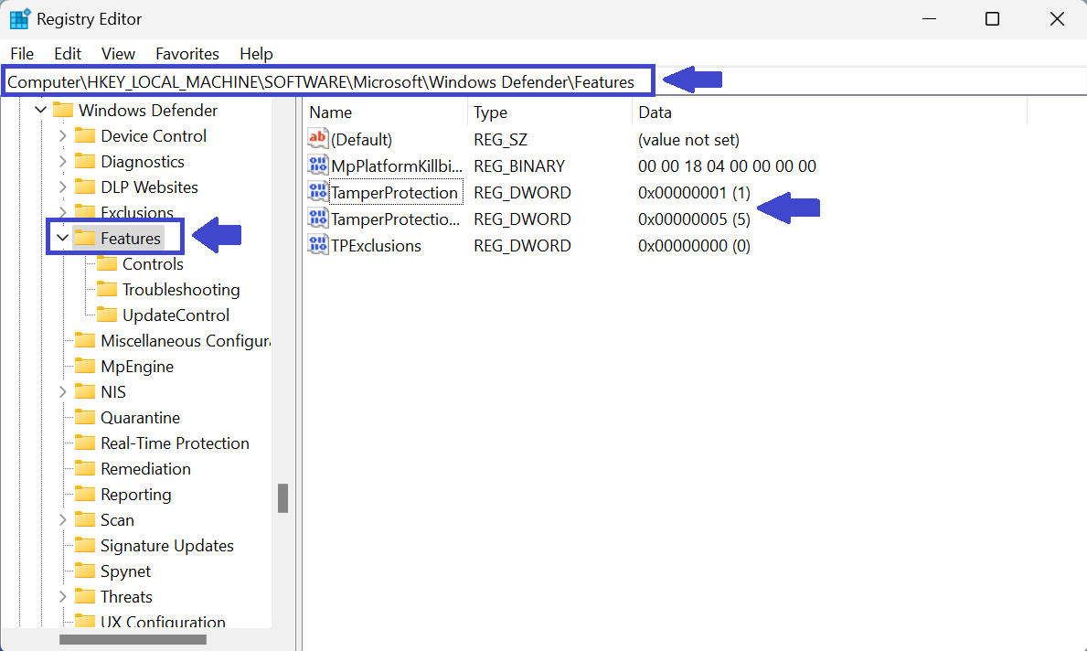 ComputerHKEY_LOCAL_MACHINESOFTWAREMicrosoftWindows DefenderFeatures