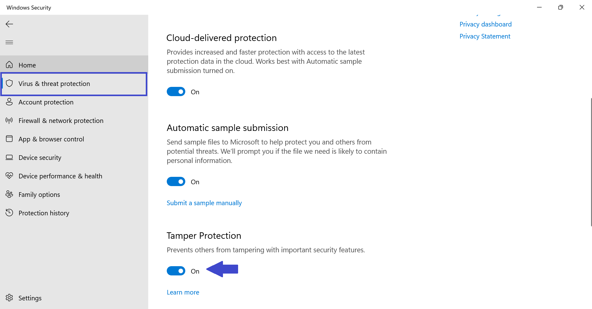 Ha engedélyezve van, a jogellenes védelem megakadályozza a fontos rendszerbiztonsági konfigurációs beállítások változásait, különösen azokat a változásokat, amelyeket közvetlenül a Windows Security alkalmazáson keresztül hajtanak végre. A cél az, hogy megakadályozzák a rosszindulatú szoftvereket vagy akár harmadik féltől származó alkalmazásokat abban, hogy megváltoztassák a fontos biztonsági beállításokat a Windows Defender Antivirus és más eszközökben.