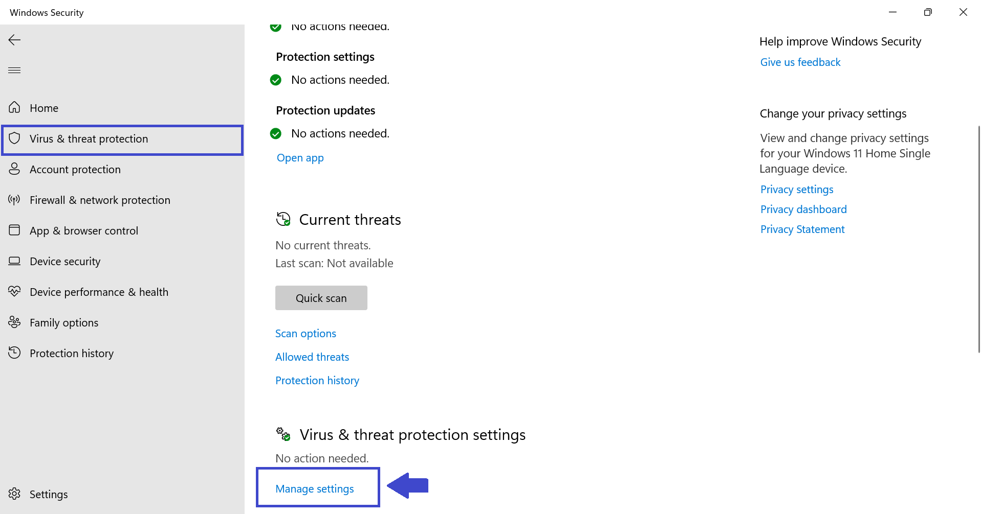 4. lépés:Most vegye figyelembe az alábbi képet. Kattintson a beállítások kezelése linkre a vírus és a fenyegetések védelme alatt.