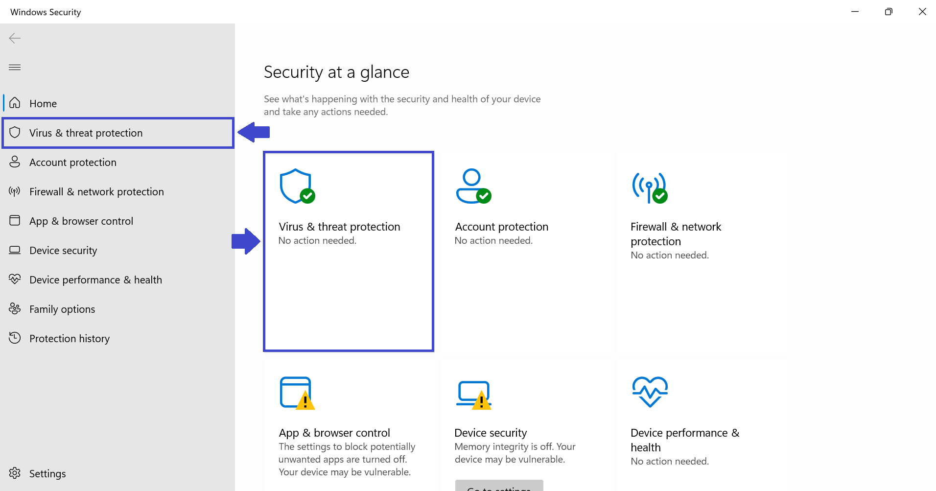 3. lépés:Itt a Windows Security -ban menjen a vírus és a fenyegetések védelmére. Vagy rákattinthat a bal oldali panelen lévő „Vírus és fenyegetésvédelem” -re vagy a jobb oldalon.
