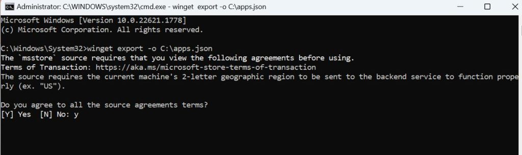 A fent említett parancs az Apps.json nevű fájlt generál a Winget exportálásához. Ezenkívül létrehozunk egy szöveges fájlt, amelynek teljes kimenete van a parancssorban. A kizárt alkalmazások manuálisan letölthetők és később telepíthetők a fájl biztonsági másolatának felhasználásával.