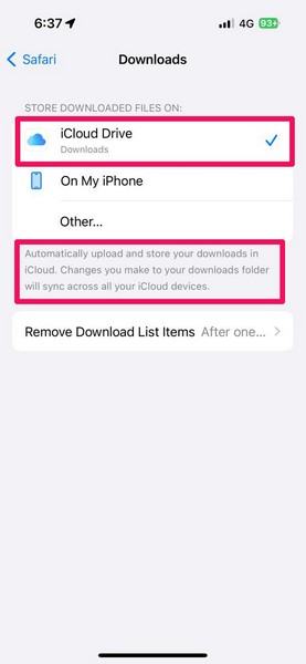 4. Érintse meg az iCloud meghajtó lehetőséget vagy a többi rendelkezésre álló lehetőségetA letöltött fájlok mentési helyének megváltoztatásához. Ne feledje, hogy az iCloud meghajtó opció kiválasztása automatikusan szinkronizálja a letöltött fájlokat az Apple ID -hez csatlakoztatott összes Apple eszközzel, így ezekhez az eszközök bármelyikén keresztül elérhető.