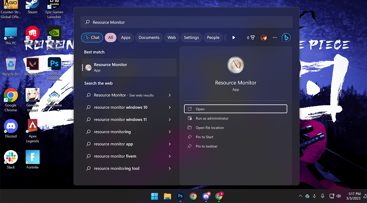 - NyitottIndul> KeresésErőforrás -monitor> A megnyitáshoz kattintson a felső eredményre.